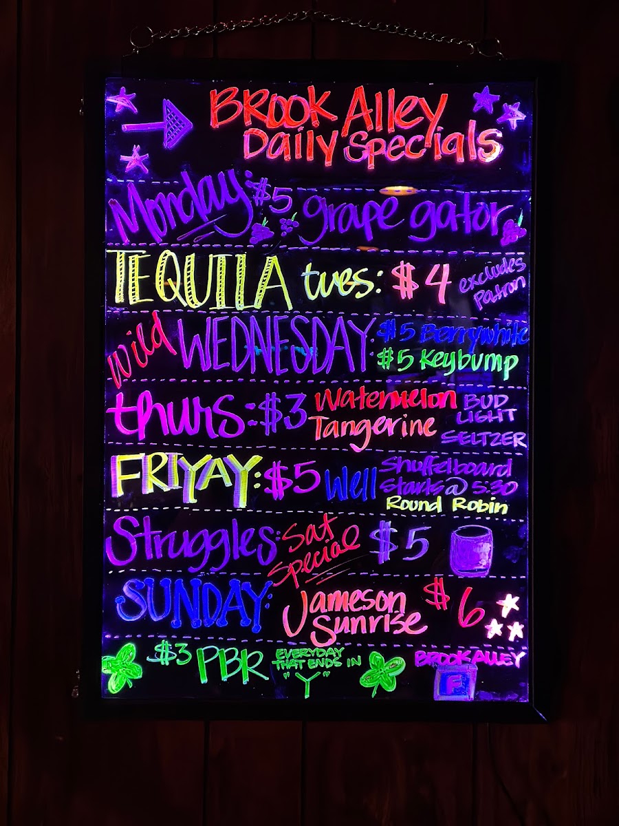 Whether you're a long-time local or a first-time visitor, Brook Alley promises a memorable experience filled with great people and good times.